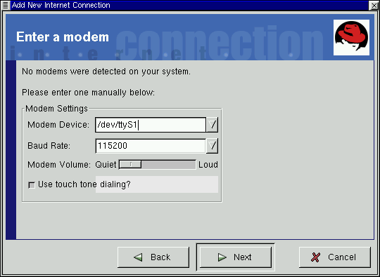 The Add New Internet Connection dialog allows you to easily configure your system for an Internet connection, helping you to locate your modem, enter the account information and connect.