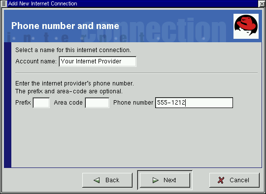 In the Phone number and name dialog (see Figure 5-5), you should enter both the name you would like to give your account and the telephone number of your Internet service provider. Ordinarily, it isn't necessary to provide the prefix or area code of your ISP.