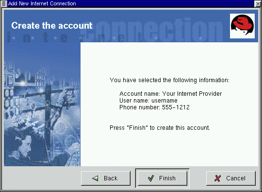 If you're satisfied with your entries, click Finish to create the account; if you want to modify the information, select the Back button to go to a previous screen.