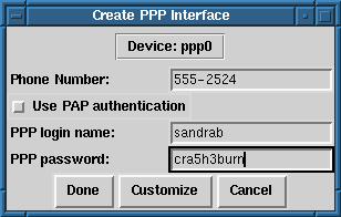 Adding a PPP interface can be as simple as supplying the phone number, login name and password in the Create PPP Interface dialog shown in Figure 3-43. If you must use PAP authentication for your PPP connection, choose Use PAP authentication. In many cases some degree of customization will be needed to establish a PPP connection. Choosing the Customize button will allow you to make changes to the hardware, communication, and networking settings for the PPP interface.