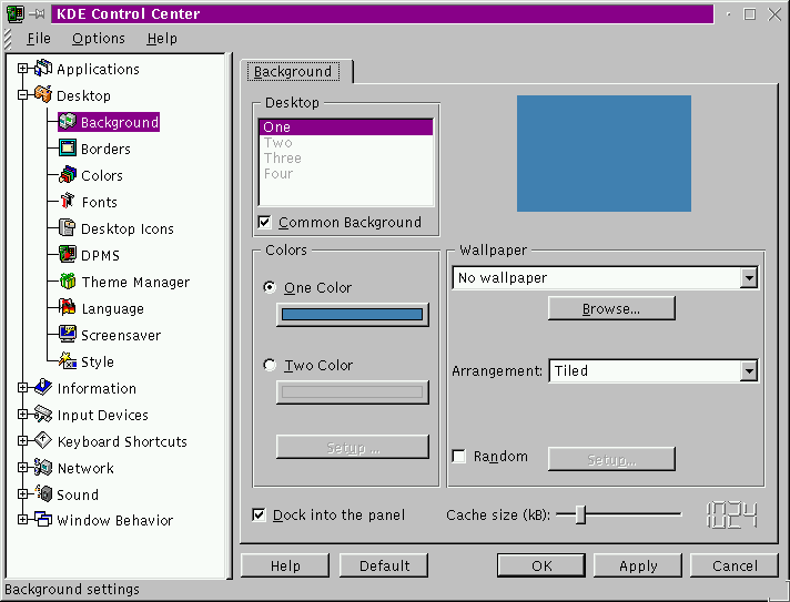 A unique feature of the Background category in the KDE Control Center is the option to create distinct backgrounds for each desktop. When the Common Background option is unchecked in the Desktop panel, the labels for each of your desktops will be highlighted. Click on a label to customize the corresponding desktop. (Checking the Common Background label will apply your background selections to all your desktops. Note that you can add both colors and/or wallpaper to each of your desktops, as long as the Common Background option is unchecked.