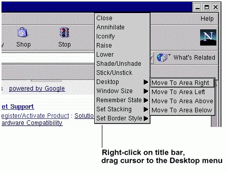 For example, by using GNOME and the Enlightenment window manager (which literally manages how your windows are displayed), you can move a window from one desktop to another by clicking on the application's title bar and "dragging" the application beyond the left, right, top or bottom border of your screen.