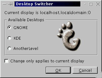 You can change environments using the Switchdesk utility (see Figure 3-13). Whether you're using GNOME, KDE or AnotherLevel, you can select your new environment in Switchdesk, then log out of your session. When you restart your session, you'll find your new environment.