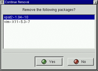 Once you've begun the uninstall, Gnome-RPM asks for confirmation, showing a window like the one in Figure 7-14. All of the packages that are about to be uninstalled are listed. You should look at them all to ensure you're not about to remove something you want to keep. Clicking the Yes button will start the uninstallation process. After it completes, the packages and groups that have been removed will disappear from any windows they were in.