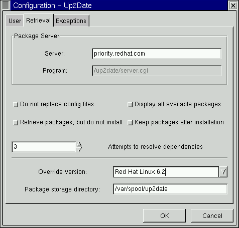 Retrieval -- Specify the name of the server and certain installation instructions, such as which version of Red Hat Linux to update and whether to install as well as download packages.