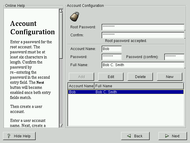 The root password must be at least six characters long; the password you type is not echoed to the screen. You must enter the password twice; if the two passwords do not match, the installation program will ask you to enter them again.
