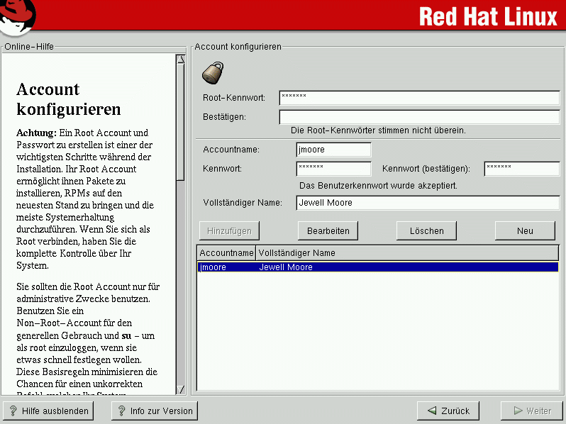 Ein Root-Account und Passwort zu erstellen ist einer der wichtigsten Schritte während der Installation. Ihr Root-Account ist dem Administrator-Account von Windows NT sehr ähnlich. Ihr Root-Account ermöglicht es Ihnen Pakete zu installieren, RPMs auf den neuesten Stand zu bringen und den Großteil der Systemerhaltung durchzuführen. Wenn Sie sich als Root verbinden, haben Sie die komplette Kontrolle über Ihr System.