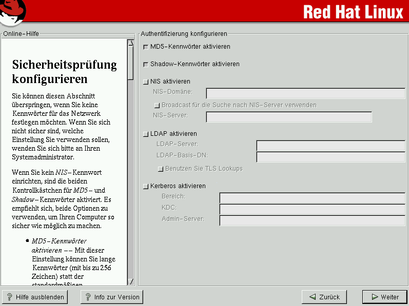 Kerberos aktivieren — Bei Kerberos handelt es sich um ein sicheres System, das Authentifizierungsdienste für Netzwerke zur Verfügung stellt. Weitere Informationen zu Kerberos finden Sie unter Verwenden von Kerberos 5 in Red Hat Linux. Ihnen stehen drei Optionen zur Auswahl: