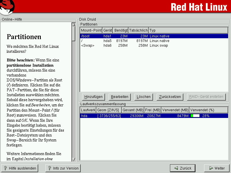 Red Hat Linux benötigt mindestens eine Partition, eventuell auch mehr. Mehr Informationen hierzu finden Sie in Einführung in die Festplattenpartition im Offizielle Red Hat Linux Referenzhandbuch. |