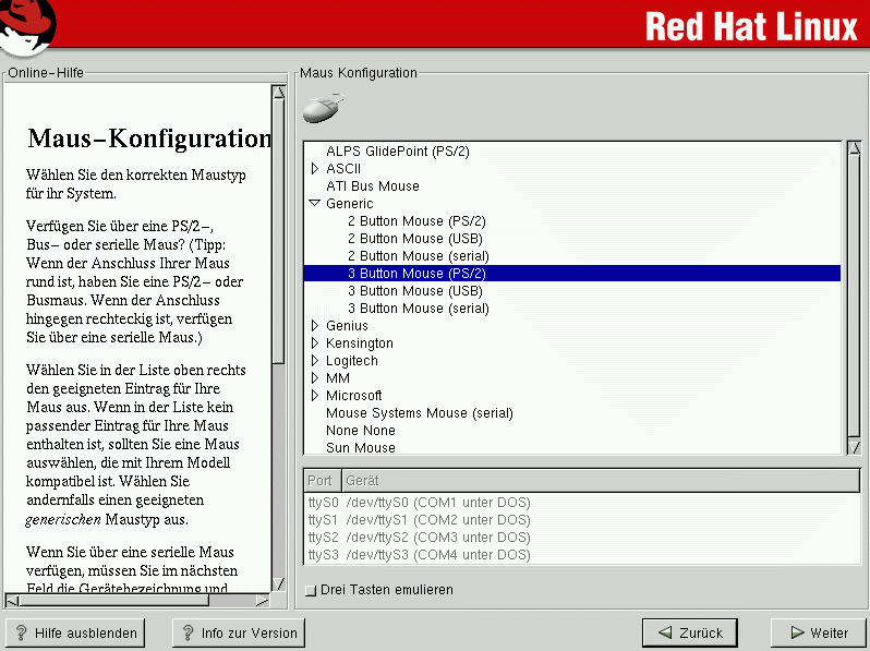 Die Schnittstelle Ihrer Maus können Sie ermitteln, indem Sie überprüfen, auf welche Weise das Mauskabel an Ihr System angeschlossen ist. Wenn der Stecker am Ende des Mauskabels mit einem rechteckigen Port verbunden ist, handelt es sich um eine serielle Maus. Wenn der Port rund ist, haben Sie eine PS/2-Maus. Falls Sie Red Hat Linux auf einem Laptop-Computer installieren, so ist das Zeigergerät in den meisten Fällen PS/2-kompatibel.