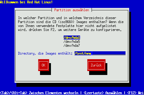 Geben Sie den Gerätenamen der Partition ein, in der sich die Red Hat ISO-Images befinden. Es gibt auch ein Verzeichnis mit der Bezeichnung Verzeichnis, in dem sich Images befinden. Wenn sich die Red Hat ISO-Images nicht im Root-Verzeichnis dieser Partition befinden, geben Sie den Pfad zum Verzeichnis der ISO-Images ein (wenn die ISO-Images beispielsweise unter /test/new/Red Hat installiert sind, geben Sie /test/new ein.)