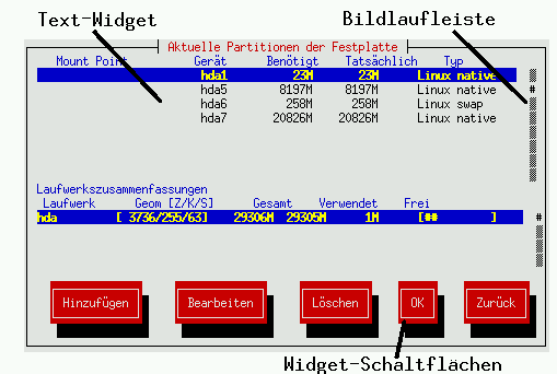 Text-Widget — Text-Widgets sind Bilschirmbereiche zur Anzeige von Text. Einige Text-Widgets enthalten weitere Widgets, z.B. Kontrollkästchen. Eine Bildlaufleiste neben dem Text-Widget weist darauf hin, dass nicht alle Informationen auf einmal in das Textfenster passen. Wenn sich der Cursor innerhalb des Textfensters befindet, können Sie mit der Nach-oben-Taste und der Nach-unten-Taste alle verfügbaren Informationen anzeigen. Die aktuelle Position wird in der Bildlaufleiste mit dem Zeichen # gekennzeichnet. Je nachdem, wie Sie sich im Text bewegen, wird dieses Zeichen auf der Bildlaufleiste nach oben oder unten verschoben.