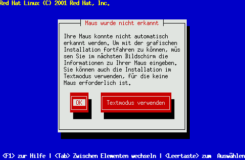 Das Installationsprogramm wird zuerst versuchen, im Frame Buffer-Modus zu starten. Ist das nicht möglich, wird es einen Modus mit niedrigerer Auflösung wählen. Sollte das ebenfalls fehlschlagen, wechselt das Installationsprogramm in den Textmodus.