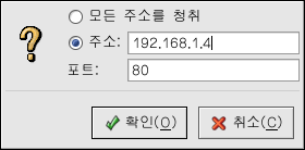¿äûÀ» ¼ö¿ëÇÒ Ãß°¡ Æ÷Æ®¸¦ Á¤ÀÇÇϽ÷Á¸é Ãß°¡ ¹öưÀ» Ŭ¸¯ÇϽʽÿÀ. ±×¸² 19-2°ú À¯»çÇÑ Ã¢ÀÌ ³ªÅ¸³¯ °ÍÀÔ´Ï´Ù. Á¤ÀÇµÈ Æ÷Æ® »ó¿¡¼ ¸ðµç IP ÁÖ¼Ò¸¦ ûÃëÇϱâ À§Çؼ ¸ðµç ÁÖ¼Ò¸¦ ûÃë ¿É¼ÇÀ» ¼±ÅÃÇϽðųª, ¶Ç´Â ÁÖ¼Ò ÀԷ¶õ¿¡ ¼¹ö°¡ ¿¬°áÀ» ¹Þ¾ÆµéÀÏ Æ¯Á¤ IP ÁÖ¼Ò¸¦ ÁöÁ¤ÇϽñ⠹ٶø´Ï´Ù. ÇÑ Æ÷Æ® ¹øÈ£ ´ç ÇÑ °³ÀÇ IP ÁÖ¼Ò¸¸ ÁöÁ¤ÇϽʽÿÀ. ¸¸ÀÏ µ¿ÀÏÇÑ Æ÷Æ® ¹øÈ£¿¡ ÇÑ °³ ÀÌ»óÀÇ IP ÁÖ¼Ò¸¦ ÁöÁ¤ÇϽ÷Á¸é, °¢ IP ÁÖ¼Ò¿¡ ´ëÇÑ Ç׸ñÀ» »ý¼ºÇÏ¼Å¾ß ÇÕ´Ï´Ù. ¸¸ÀÏ °¡´ÉÇÏ´Ù¸é DNS °Ë»ö ½ÇÆÐ¸¦ ¹æÁöÇϱâ À§ÇØ µµ¸ÞÀÎ¸í ´ë½Å IP ÁÖ¼Ò¸¦ »ç¿ëÇϽñ⠹ٶø´Ï´Ù. DNS¿Í Apache °ü·Ã ¹®Á¦Á¡¿¡ ´ëÇÑ º¸´Ù ¸¹Àº Á¤º¸¸¦ ¿øÇϽŴٸé, http://httpd.apache.org/docs-2.0/dns-caveats.htmlÀ» ÂüÁ¶ÇϽñ⠹ٶø´Ï´Ù.